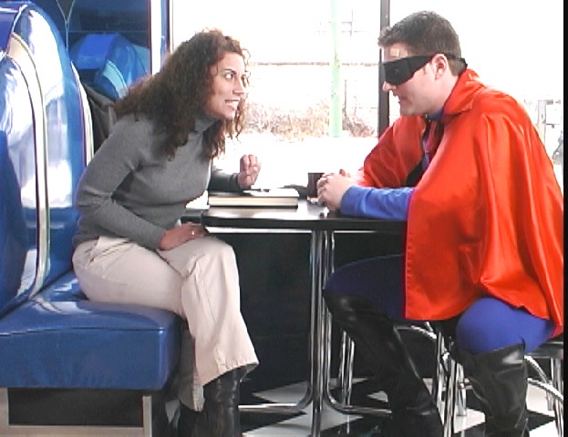 In "Meeting Mr. Marvelous," a woman finds herself waiting in a diner for a date from a personal ad. In the diner are an eclectic group of people from this crazy world we live in. I played "Moose." This guy is basically the weirdo big guy in the diner who seems to always be grossly stuffing his face with food. Was this type casting or what? And I must add that I don't know when I'll be able to look at another burger again! Then a masked super hero named "Mr. Marvelous" waltzes in and comedy ensues. I'll leave the rest of the story for you to watch on your own.